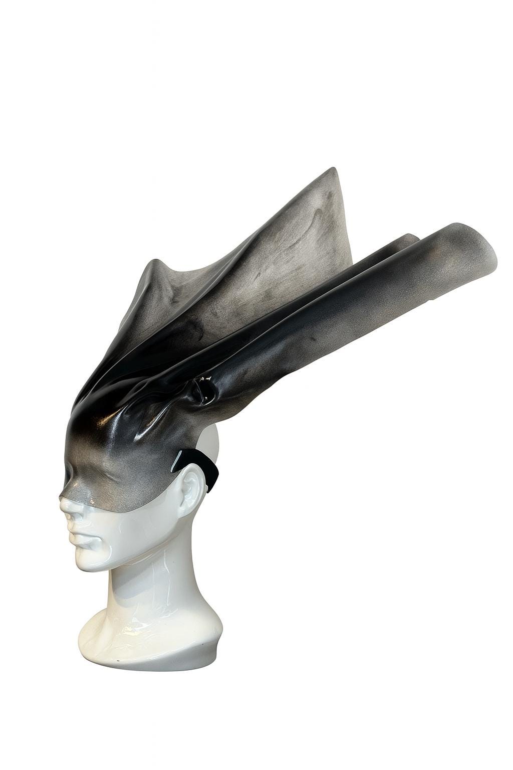 Handformed transparent sculptural face mask made from premium lightweight material designed for fashion shows photoshoots and performances. Each piece is handcrafted into a fluid shape with crystal details and an iridescent strap adjustable for comfort and secure fit.