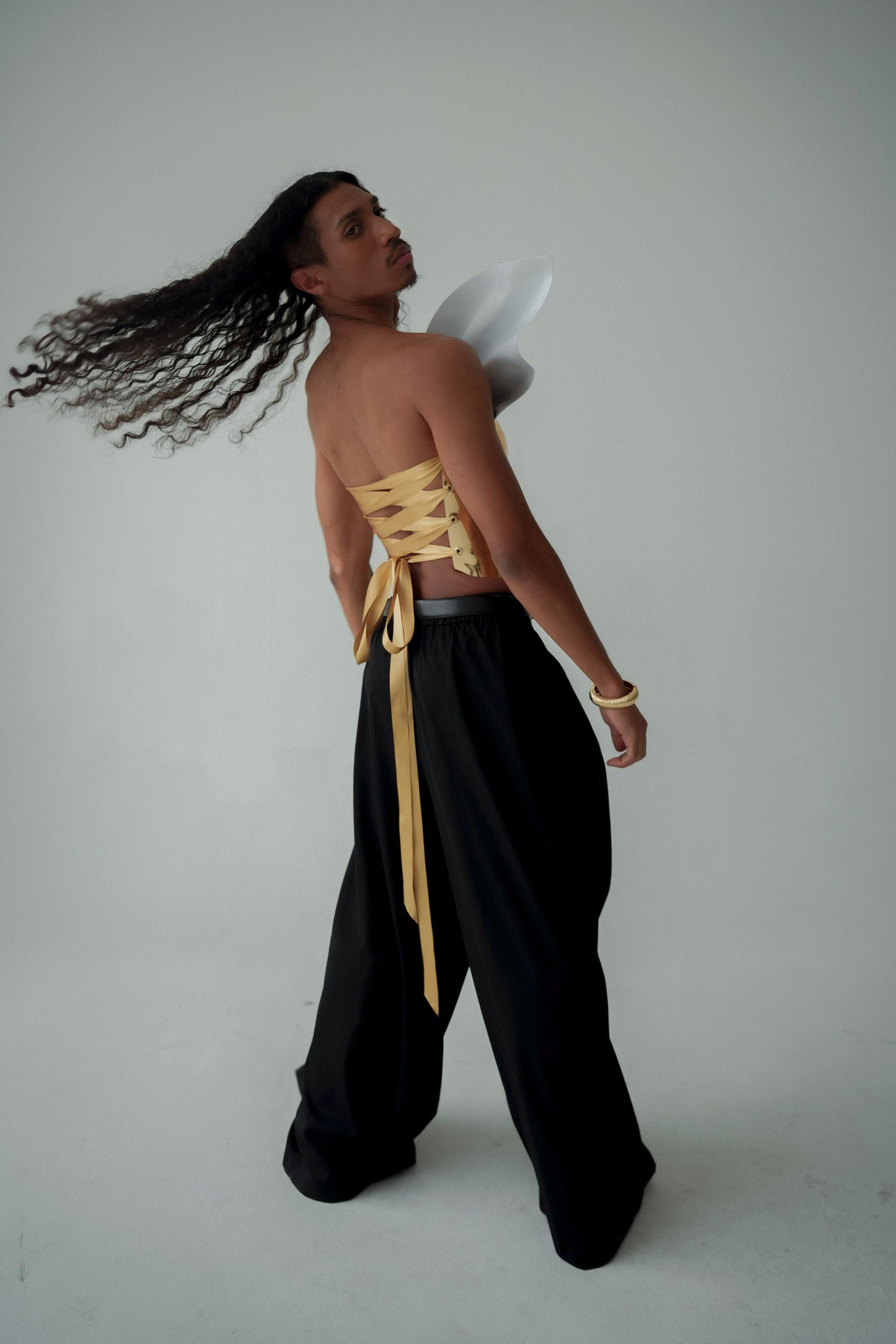 This gold armor corset is a bold, handmade sculptural chest plate designed to command attention on stage, in editorials, and at high-fashion events. Perfect for drag performances, runway styling, festival looks, and avant-garde costume design.