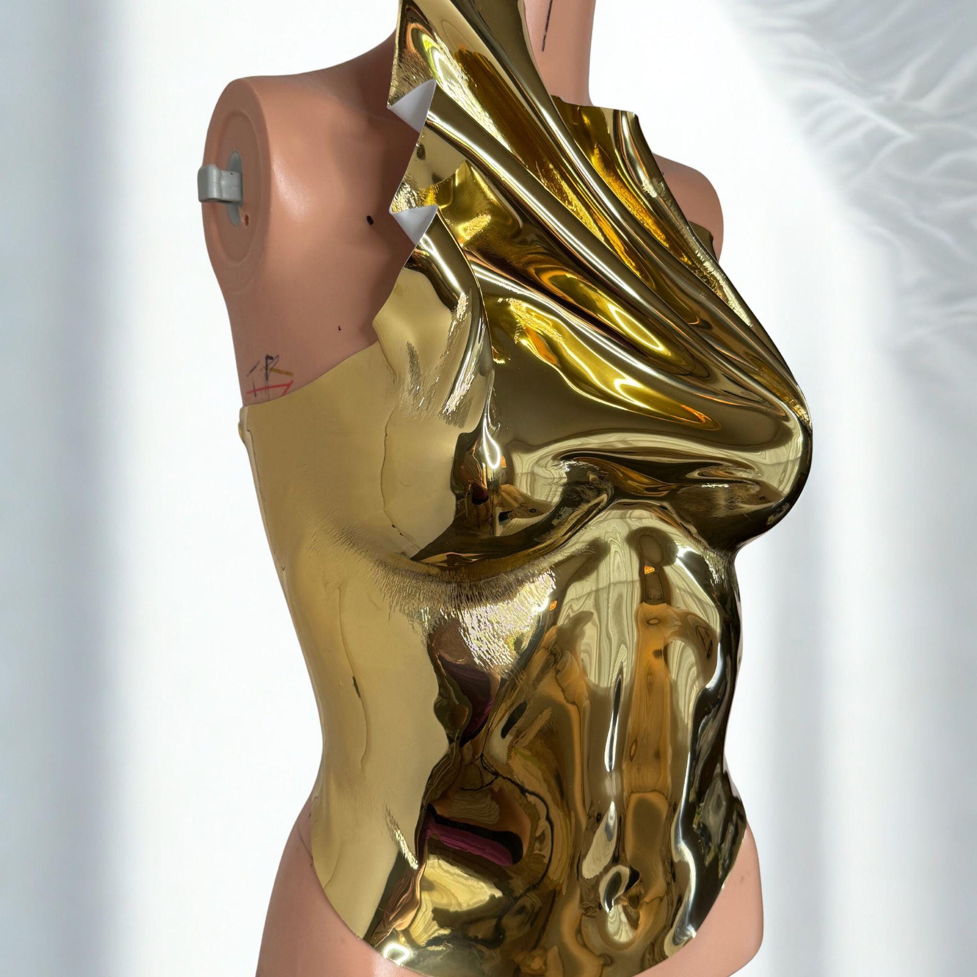 Make a statement at special events with a chrome mirror gold top rave outfit featuring a custom-fit handmade metallic prom bustier, blending steampunk and futuristic clothing for a unique Coachella look. This corset armor design ensures you stand out with style and edge.