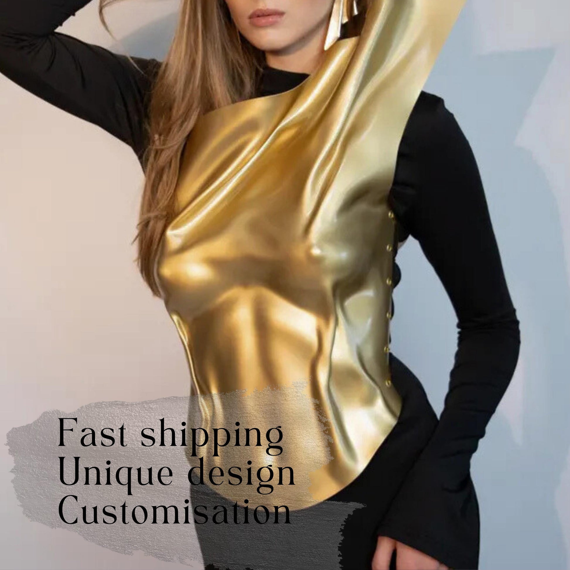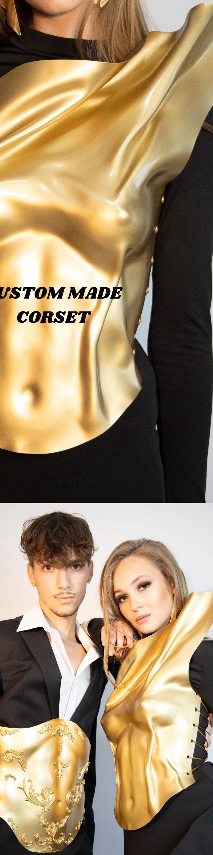 Discover our gold exclusive corset for stage performance, a custom-fit handmade red carpet outfit featuring a designer breastplate. This Avangard clothing piece is perfect for those seeking a standout look with cutting-edge y2k style.