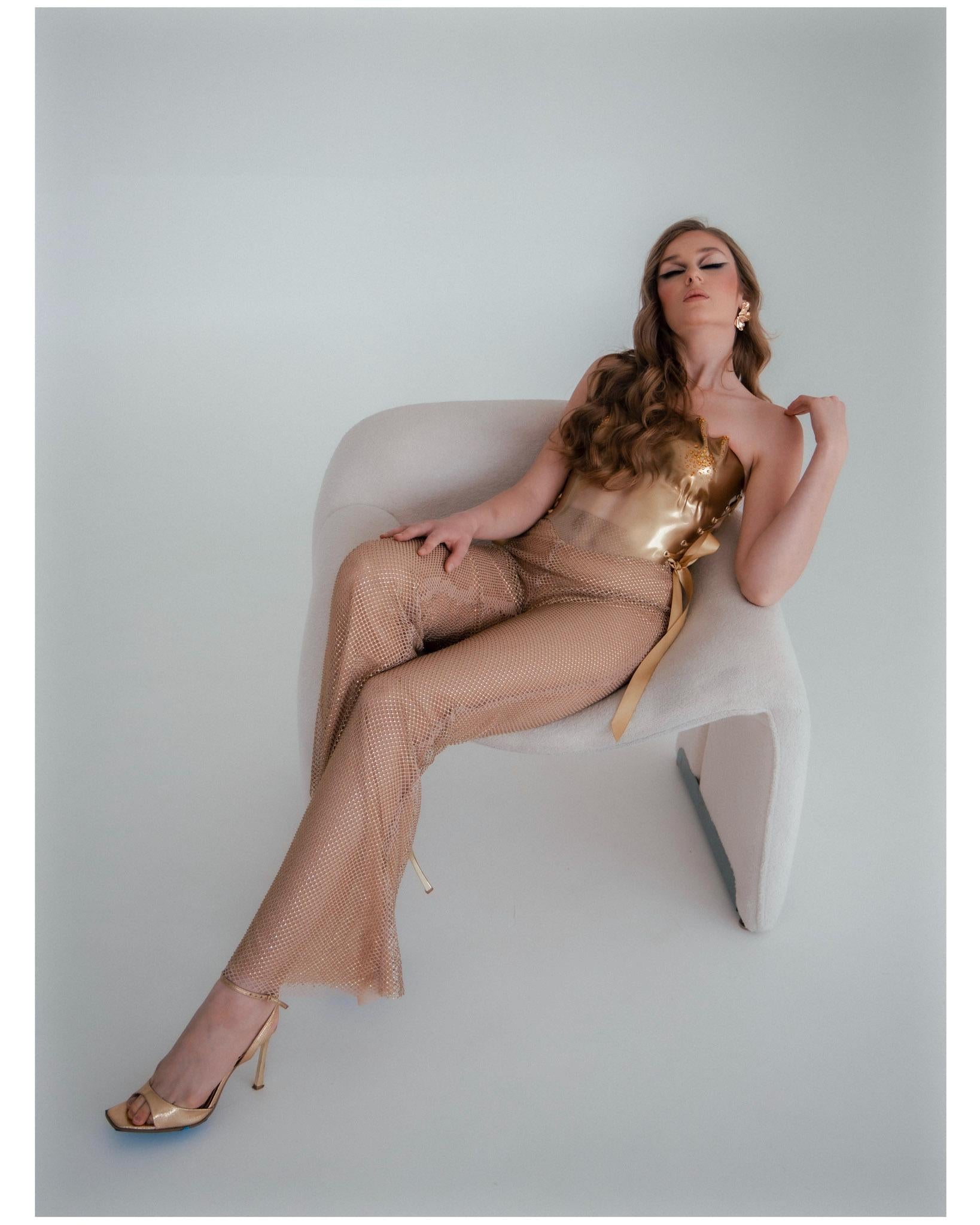 Shine at your next special event with our gold corset adorned with crystals, designed as a statement top that doubles as stunning armor. Perfect for a Coachella look, this steampunk-inspired metallic bustier combines futuristic clothing design with a custom fit, all handmade with care.