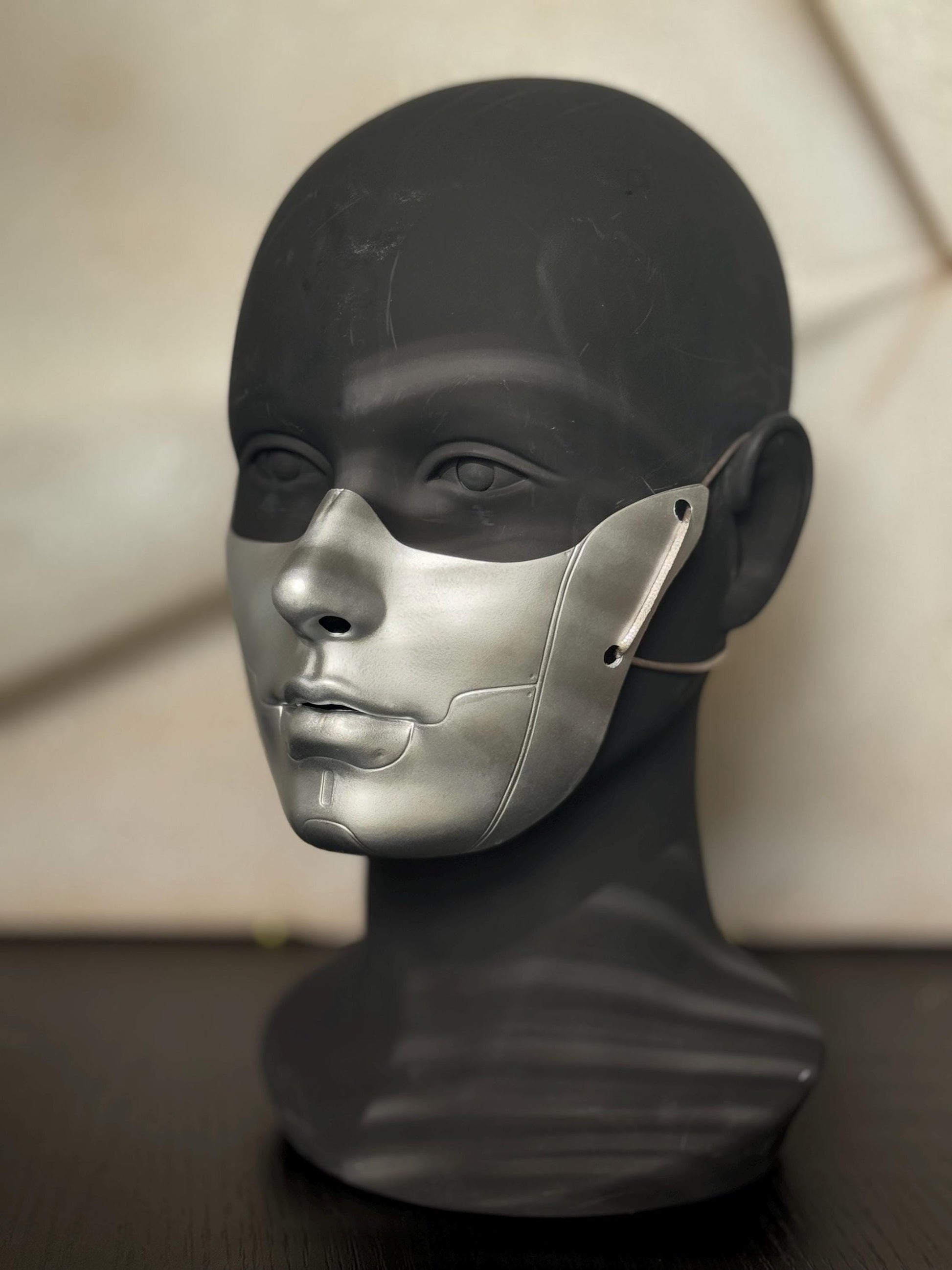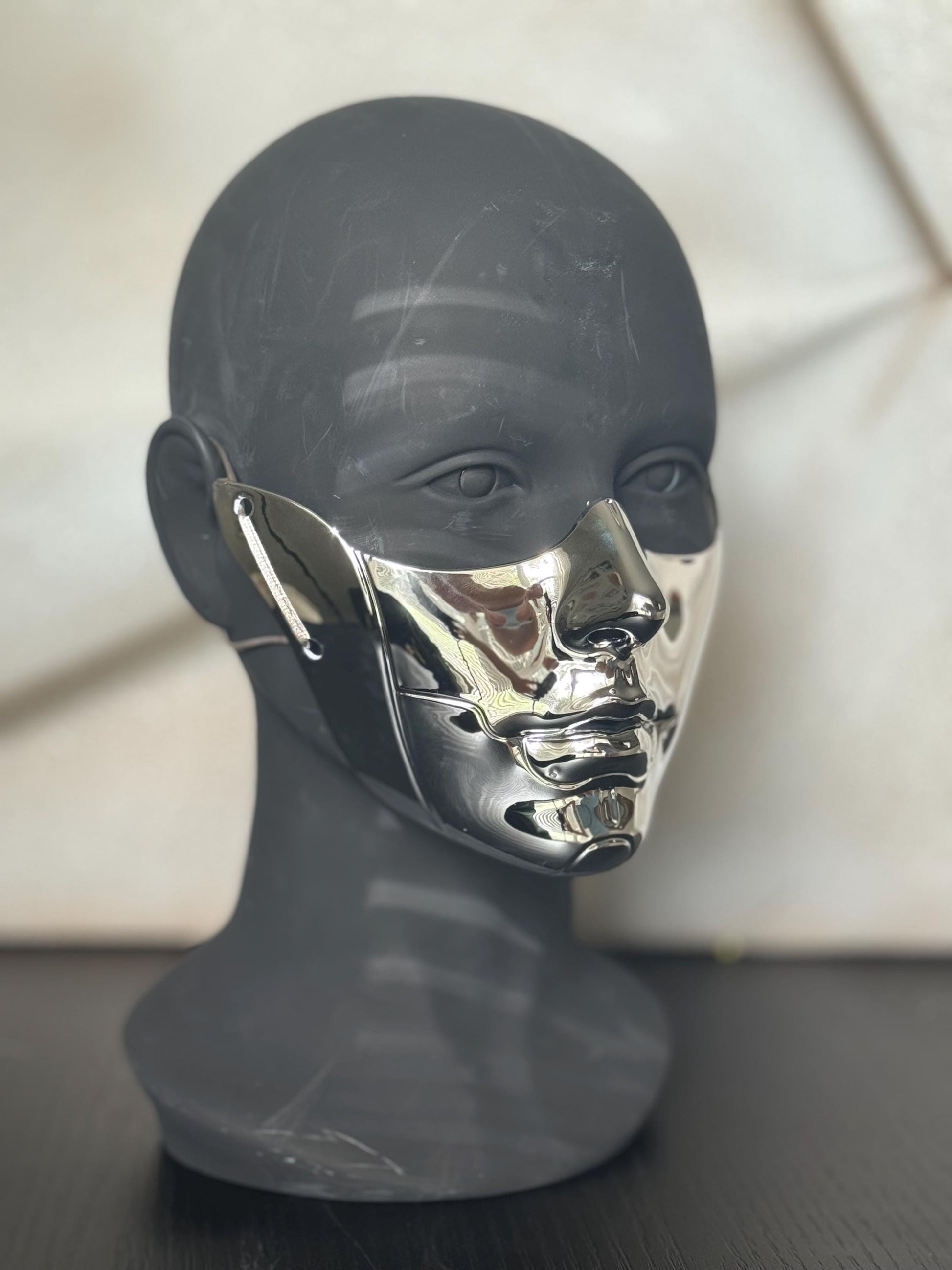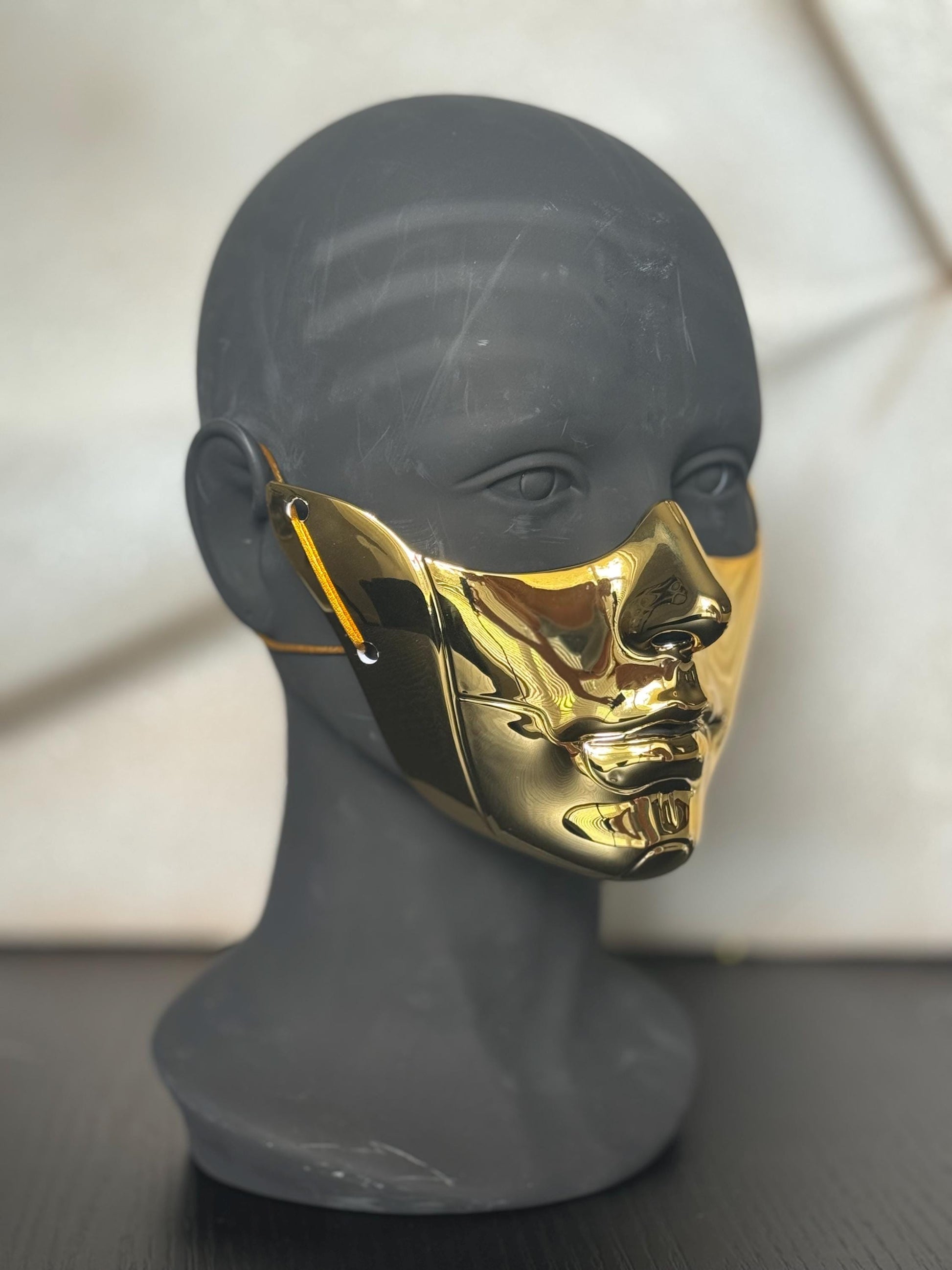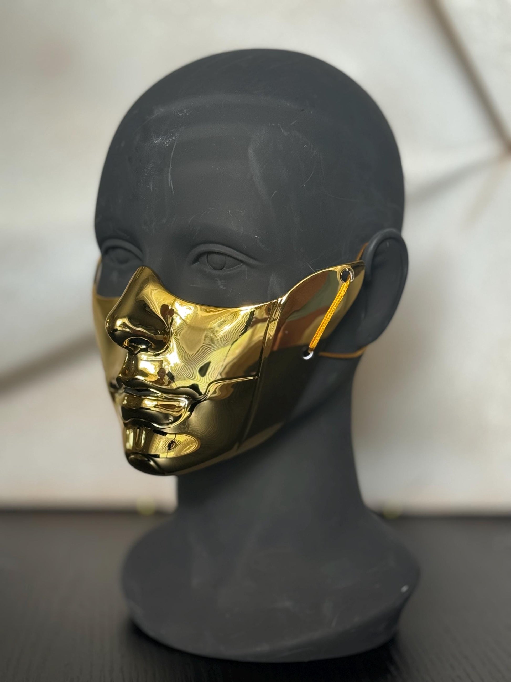 This sculptural gold half-face mask is a bold accessory for cosplay events, masquerade balls, futuristic fashion shoots, or art performances. Handcrafted for dramatic impact, this wearable art piece blends elements of cyber elegance and gothic mystery, designed for those who make an entrance.