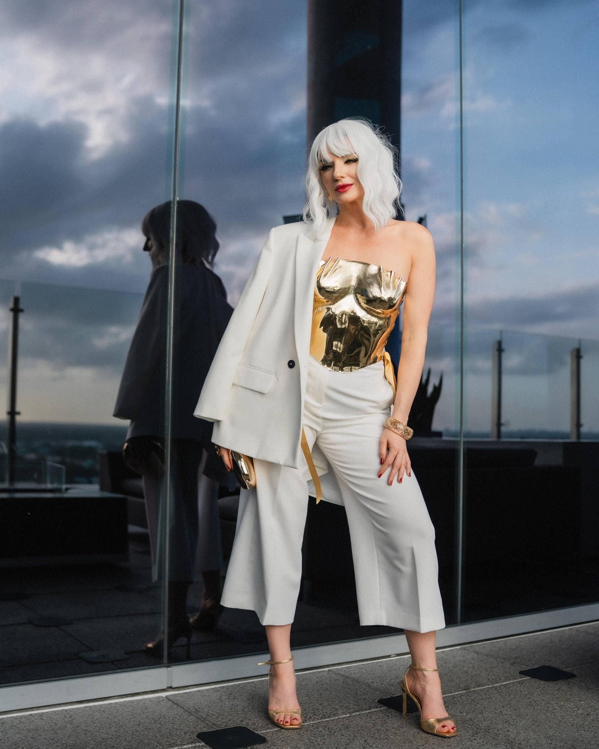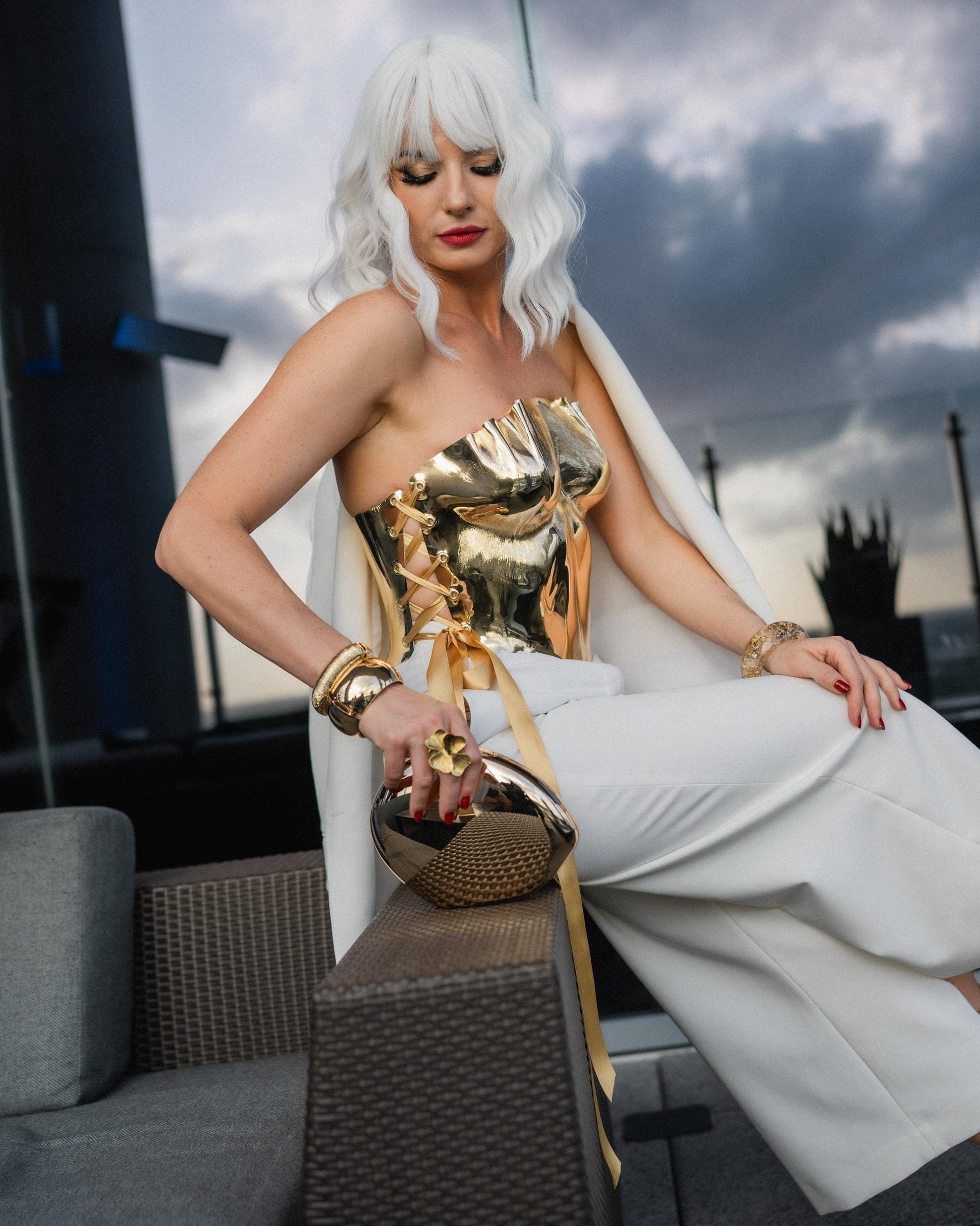 This gold Korset looks stunning with white trousers, blazers, gowns, or minimalist outfits — the mirror finish becomes the main highlight of your look.
