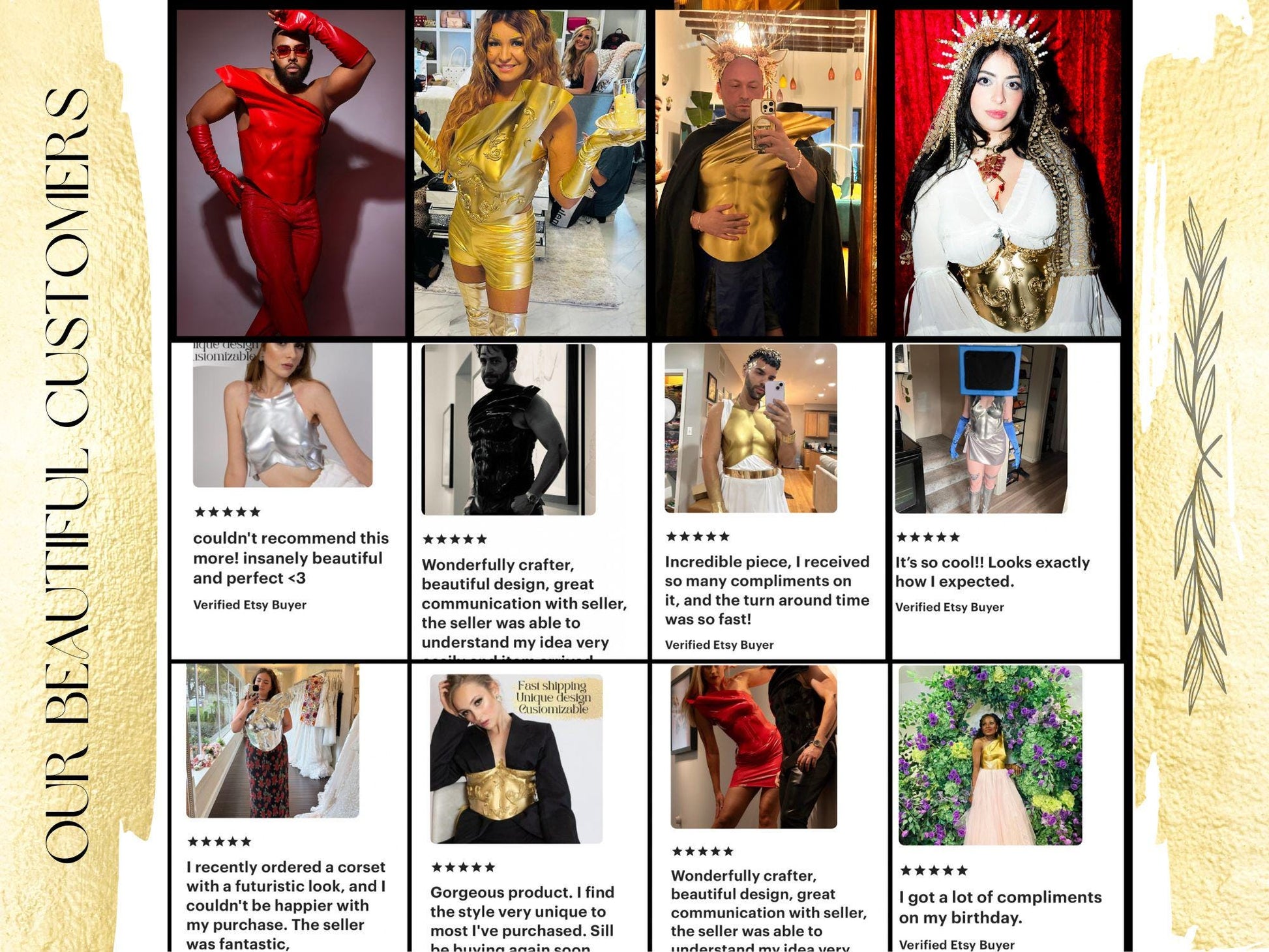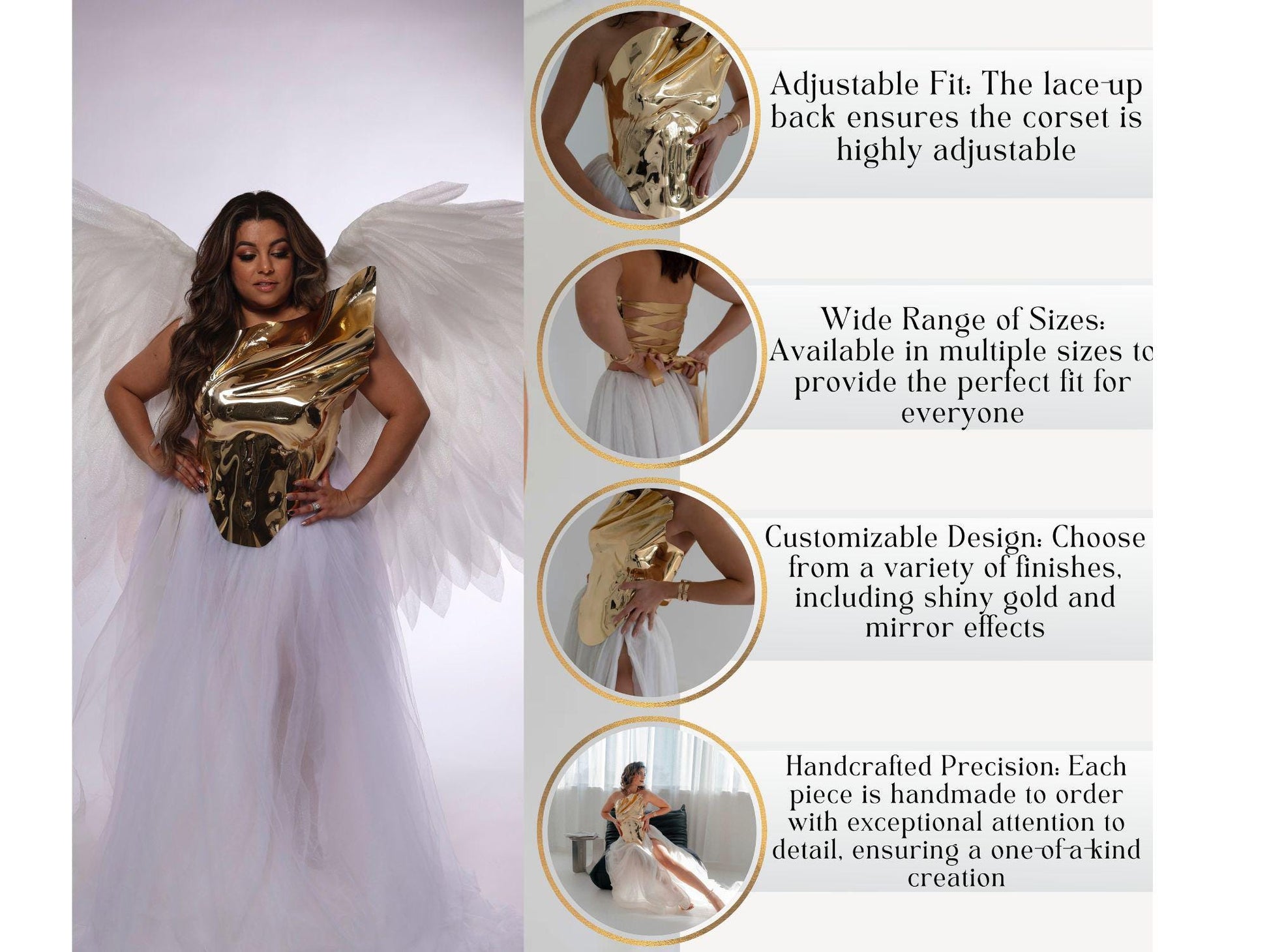 Gold Sculptural Metallic Corset Handcrafted Unique Lightweight Bold, designed to make a statement for fashion-forward individuals. Perfect for photoshoots, runway looks, powerful style, and plus-size corset lovers seeking a bold and artistic piece.