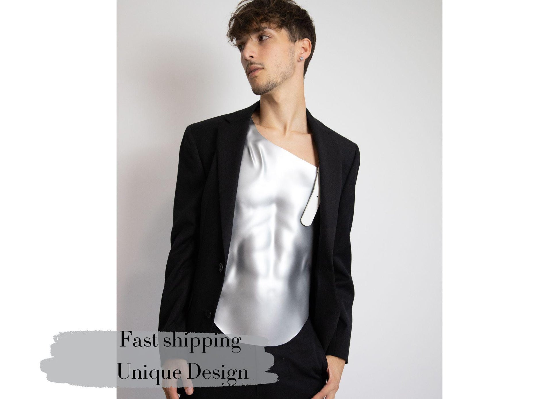 Our male metallic custom-made corset is the perfect rave outfit for achieving a futuristic male look, blending the boldness of metallic armor with sculptural design. This couture corset is a statement piece for men, embodying the essence of high fashion and modern masculinity.