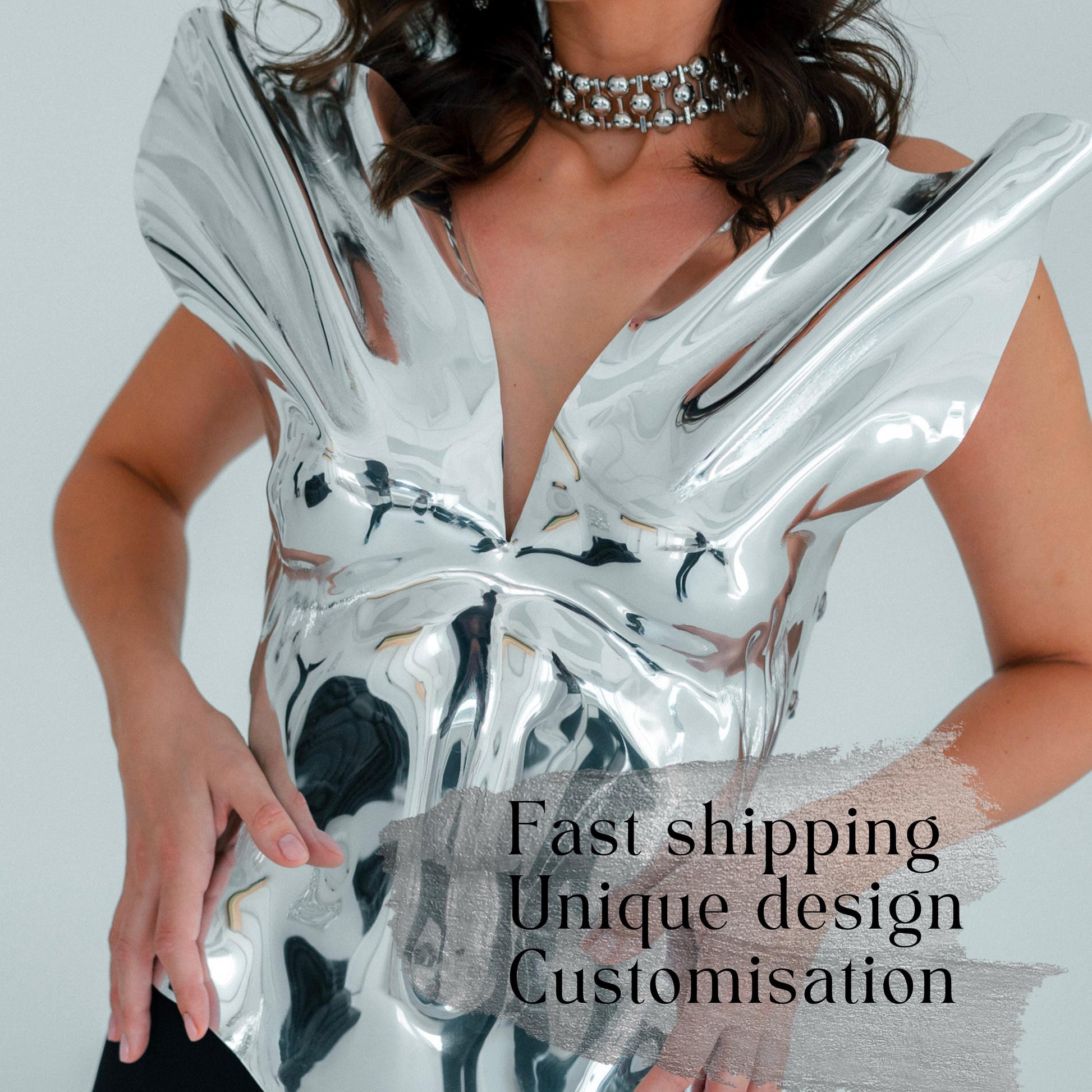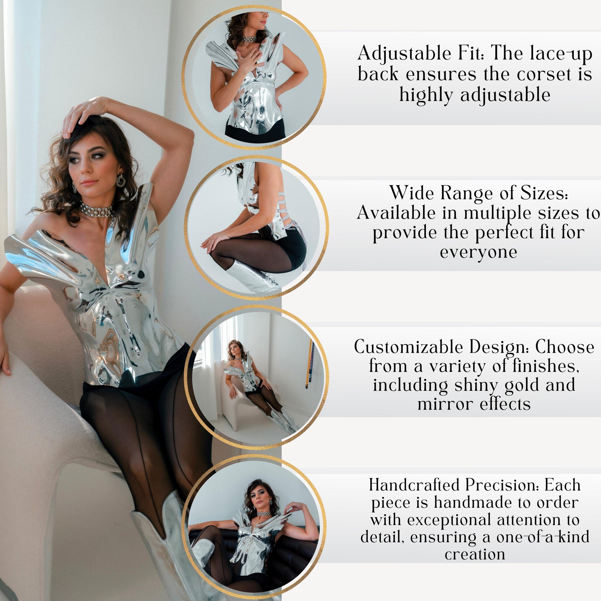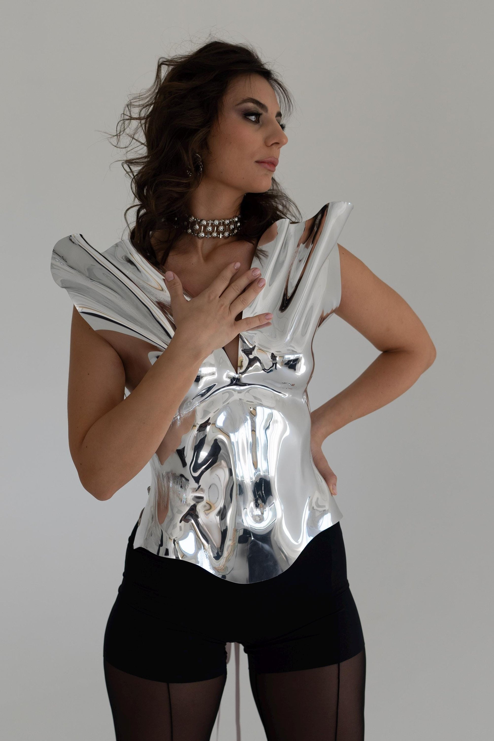 Shine at Coachella and beyond with a molded chrome mirror silver corset, designed as a custom-fit metallic bustier for an outstanding rave outfit. This unique breastplate top offers a bold look perfect for any event where you want to stand out. The example you see in the photo is silver.